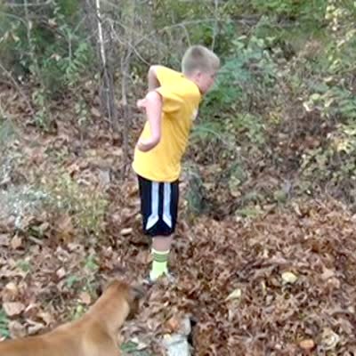 A man buries a teen girl in a pile of yard leaves and tells a dog to find her. The dog pees on the leaves and the girl jumps out.