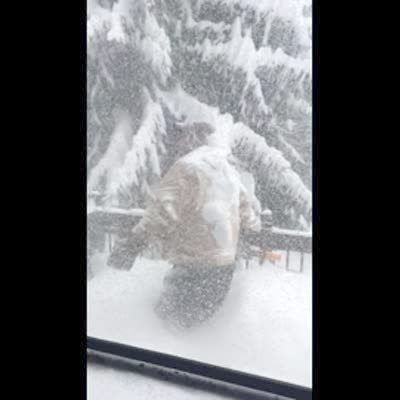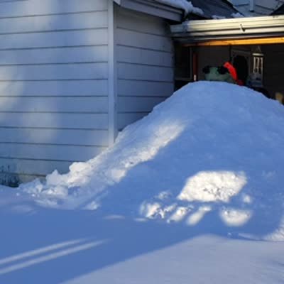 A man stands on the porch and scrapes winter snow off the roof of the house and all of it comes down at once and buries him up to his waist.
