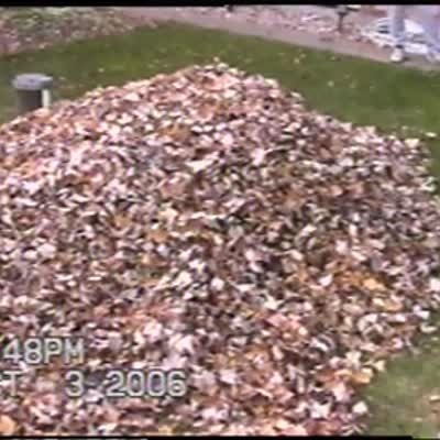 Father and son play in a leaf pile. Boy buries dad in leaves and jumps on him, hitting his groin / crotch. Dad throws boy off him.