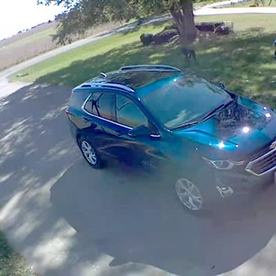 A man pulls into the driveway then he yells at something off camera. Suddenly three deer run out from the bushes in the front yard. Security footage.