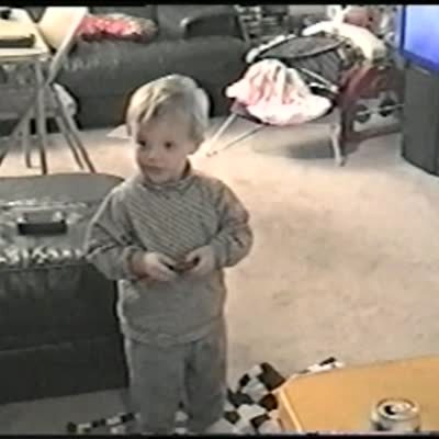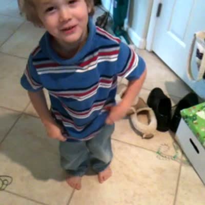 A man asks his tot son if he dressed himself that day in the kitchen indoors. The boy says yes and he has his shirt on backwards, so his dad asks him where the buttons are since it's a button-up polo and the boy looks around but can't find them. He tells his dad there are no buttons and the man asks if he put the shirt on backwards and the boy says no.