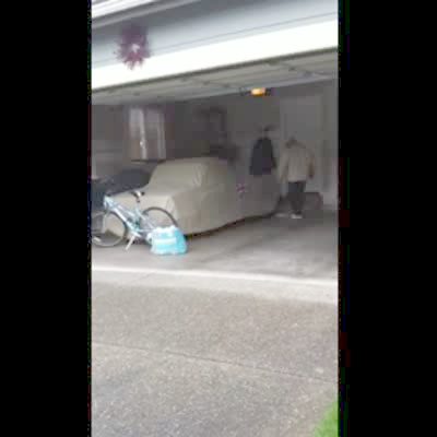 A woman in a garage hits the button to close the garage and then she tries to run outside quickly. She hits her head against the door as it comes down.