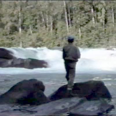 Fishing. Fisherman gets buzzed by low flying helicopter, his hat flies off.