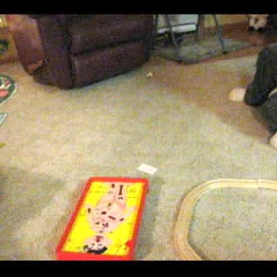 Tot boy plays the game "Operation." When it makes the buzz sound, he runs to mom afraid.