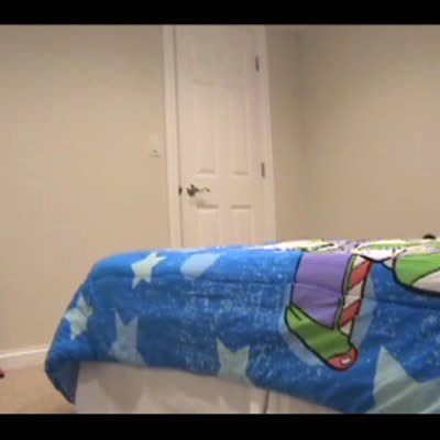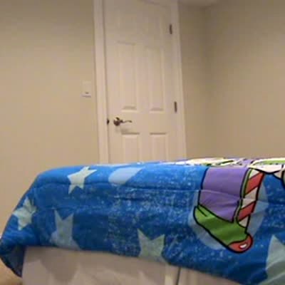 Little boy is surprised by his parents with a new Buzz Lightyear bed. He thinks the video camera is for him too.