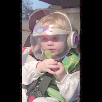 A tot boy tries to eat a lollipop but his Buzz Lightyear mask blocks his mouth.