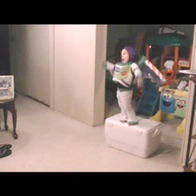 A young boy in a Buzz Lightyear costume purposefully falls off a cooler indoors. He tries to do it again when the cooler tips forward and he falls backwards. AA: Halloween.