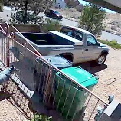 Security camera footage of a dog that stands in front of a fence in the yard and gets scared as it sees a large balloon float down the road and towards the yard. The wind blows the balloon over the fence and the dog runs away.