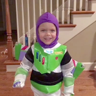 A tot girl dressed as Buzz Lightyear and says "To infinity and beyond!" She then runs, slips and falls.
