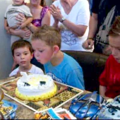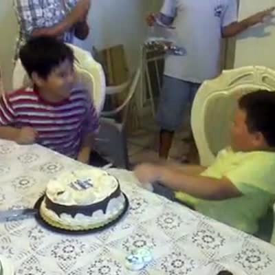 A teen boy smashes his face into his birthday cake. It's frozen and doesn't smash and he hurts his nose. Practical jokes.