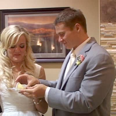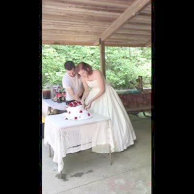 At a wedding reception, a bride smashes cake on a groom's face when he smashes some in her face and she stumbles and falls backwards. Music rights not cleared.
