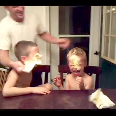 A man smashes pieces of cake into two boy's faces at home. One boy laughs and the other cries and throws a tantrum.