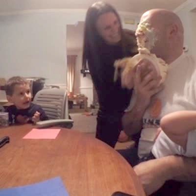 A family cheers a boy on at home as he smashes his face into his birthday cake.