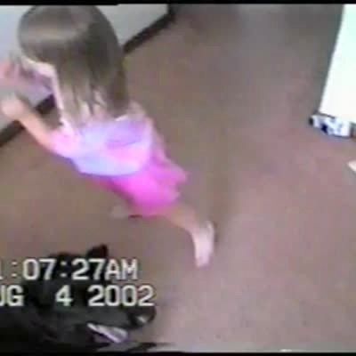A tot girl sits in a front of a birthday cake at home, and someone reaches out and smashes her face in.