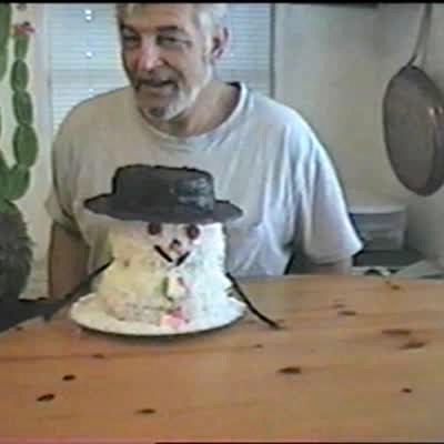Man smashes his face into a cake shaped like a snowman & destroys it. Man gets frosting all over his face.