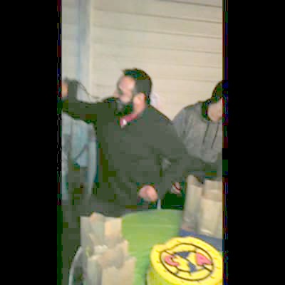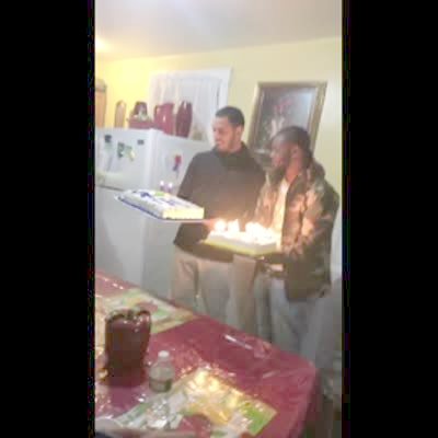 A man uses a plate to block his face when a teen boy tries to smash his head down in to his birthday cake as he leans over it in the backyard.