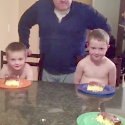 Two shirtless boys are about to have a cake eating contest when dad smashes their faces into the cake. One boy cries immediately.