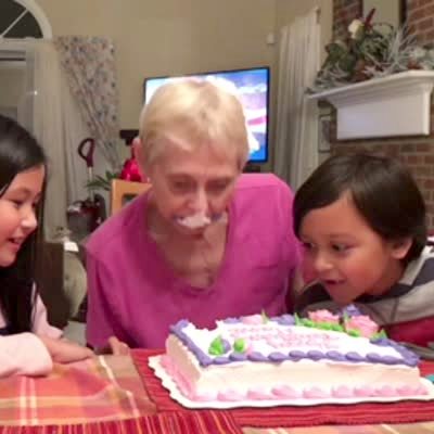 A young girl and a young boy sit at a table with their grandmother and her birthday cake. They smell the cake, and their grandmother puts her face in it. The girl and boy laugh, and their grandmother licks off the frosting.