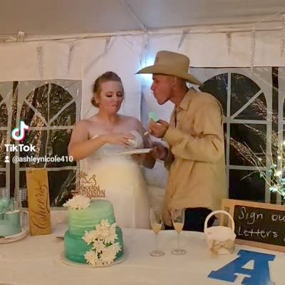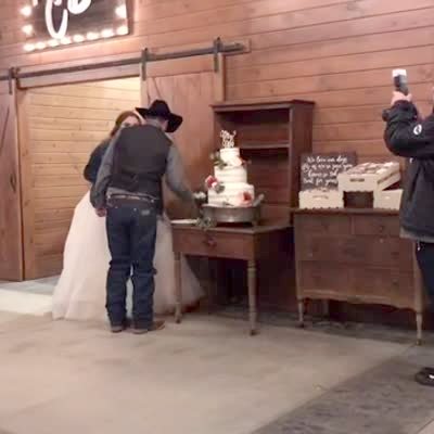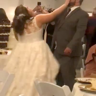A bride at a wedding reception falls on her butt when she backs away from her husband as he tries to smash a piece of wedding cake in to her face.
