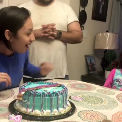A woman smashes a cake in a teen girl's face when she walks in the door at :09.