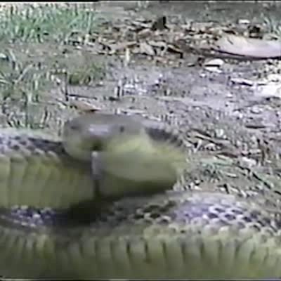 A racoon climbs onto a doorbell camera and tries to bite the lens. A woman speaks to the animal through the camera, calling it a "stinker." Security footage.