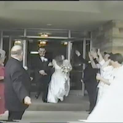 Boy shoots Nerf gun at the camera, the dart / bullet ricochets off the lens and hits man back in the eye. Bonehead.