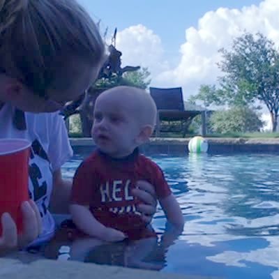 A woman pours a cup of water on her baby boy's head repeatedly in a swimming pool outdoors, a dog runs by the camera, and drops a piece of poop in front of the lens. The woman eventually notices and says "seriously?"
