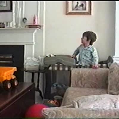 A mother plays a virtual reality video game while her son gives her instructions as he records her. She punches the camera lens by mistake, and he drops the camera.