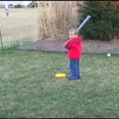 Young boy hits a plastic baseball & it flies into the camera lens. With recovery.