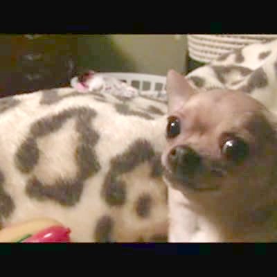 Chihuahua dog on the bed growls at the camera when the lens gets close.