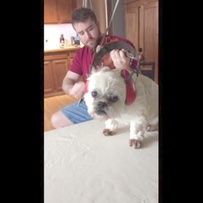A man plays on a fiddle. A dog sits in front of him with a noise cancelling head set over his ears. head phones. Dog has a pained expression on his face.