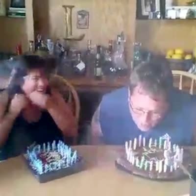A man and a woman sit at a table with two birthday cakes, and blow out their candles. The woman's hair catches on fire, and her family screams.