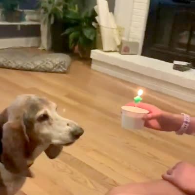 A family sings "Happy Birthday" to their golden retriever. at the end of the song the dog barks once and blows out the candle.