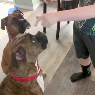 A boxer dog's family sings happy birthday to him, then he eats a hamburger out of a young boy's hand while there's a candle still on it.
