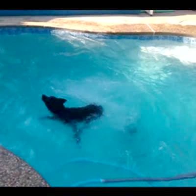 A man and a Rottweiler sit on a raft in a swimming pool, then the man tells the dog to get off of the raft. The dog gets off but then jumps back on and knocks the man into the water.