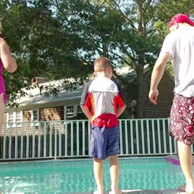 A young boy, his mother, and his father stand in a line to do cannonballs into a swimming pool. The man and woman jump in the pool but the boy only pretends to and laughs at them.