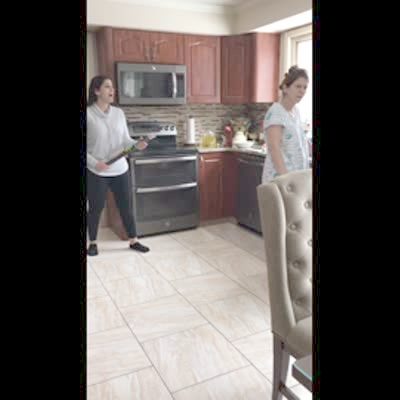 A family shoots off confetti cannons at midnight on New Year's Eve but a teen boy has his in the wrong direction and it shoots him in the groin then he falls to the ground in pain. Tik Tok music video.