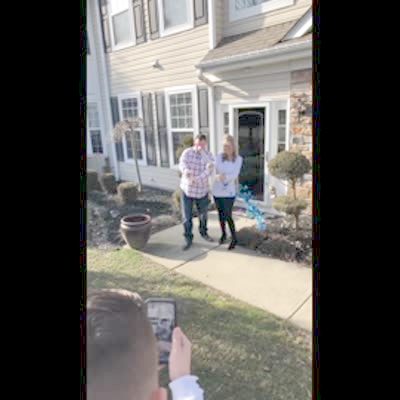 A man and woman shoot confetti powder cannons in the yard for a gender reveal and the man gets hit in the groin.