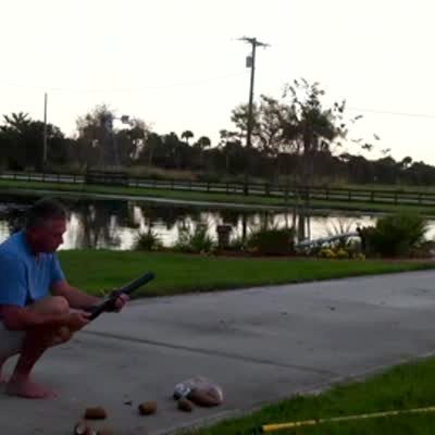 A man tries to shoot a potato out of a new potato cannon while his family watches outdoors. The potato hardly shoots into the air and the family laughs.