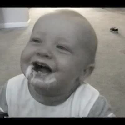 Baby boy eating ice cream cone cannot stop laughing when he takes a bite.