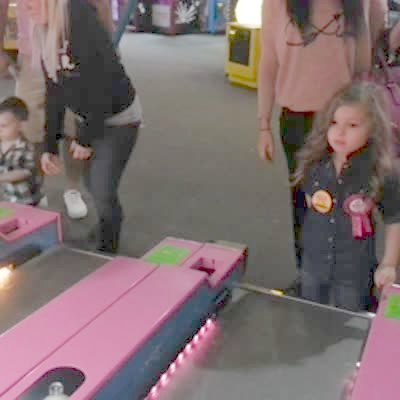 A girl repeatedly tries to throws a skeeball on a ramp in an arcade but cannot throw it hard enough. Her mother tries to help her and they launch the ball at the camera.