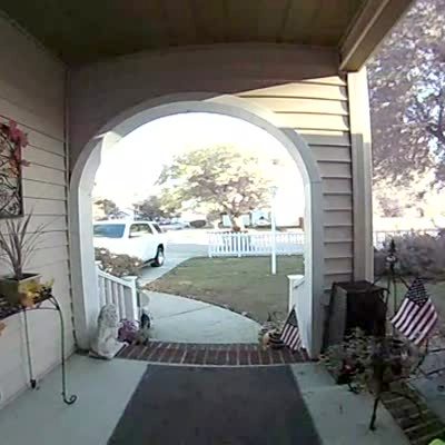 A woman tries to step up onto a porch, but she cannot make it up. She falls back and takes potted plants down with her. Security footage.