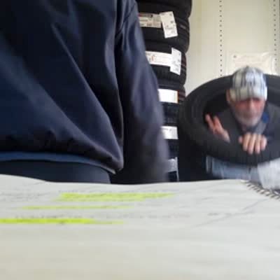 A man walks into a tire shop when a man jumps out of a tower of tires to scare him and falls down.