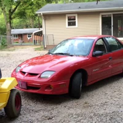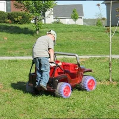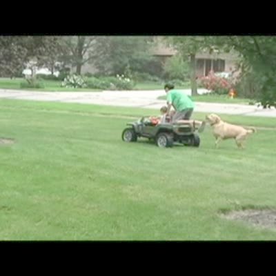 Mom rides on back of Powerwheel toy car driven by tot boy and girl. The family dog chases the car in the yard until the boy stops suddenly, slamming the mother's head into the hood of the car.