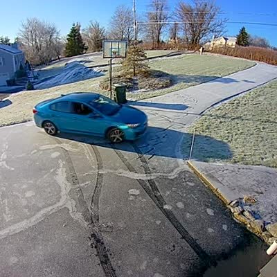 A teen boy drives a car uphill on a driveway covered in winter snow and ice and when he gets to the top of the driveway, the car stops and starts to slide backwards down the hill. The car crashes into a basketball hoop and knocks it down. Ring home security camera