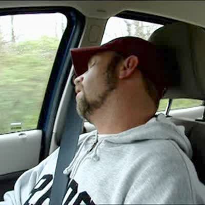 Man sleeping in car is awakened by driver who screams "oh shit." Man is scared & hits the camera when he realizes it's a practical joke. Thought it was a car accident.