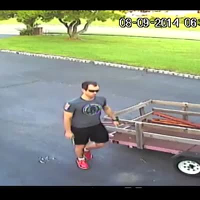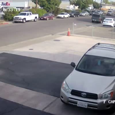 A man tries to close the back windshield on a truck and the glass shatters because a baseball was holding the window open. Security footage.