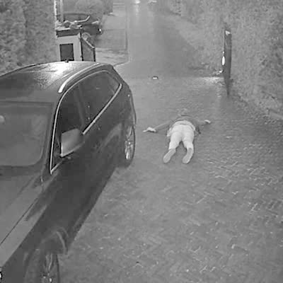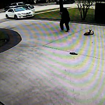 A car rolls down a driveway, then a man runs out of the house and trips and falls while the car rolls down a hill and out of sight. Security footage.