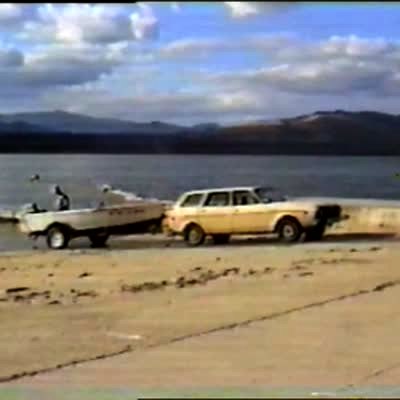 Car with boat attached parked on beach. Man slams car door, car & boat roll backwards & slide into river. Possible set up.