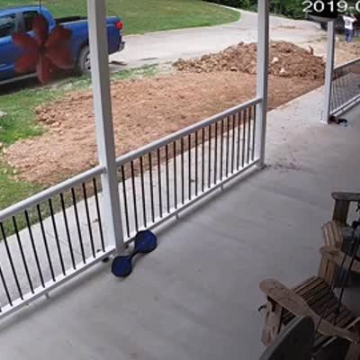 A truck crashes into a brick mailbox and it breaks on a driveway. Security footage.